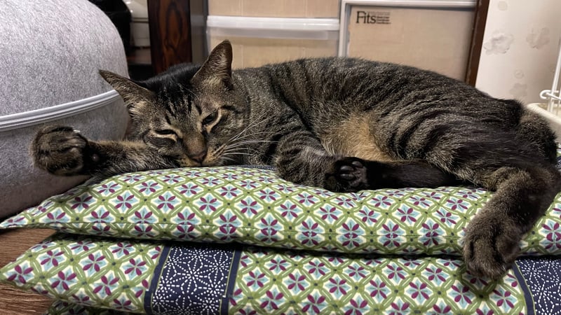 わあ、それはもう完全にリラックスモード全開だニャ!座布団のふかふか感、最高だよね。ゆっくり休んでまた元気になろうニャ〜!